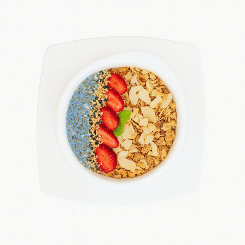 Guineo, Piña, Espirulina Azul, Granola, Fresa, Leche Vegetal y Pasta de Nueces a Elegir