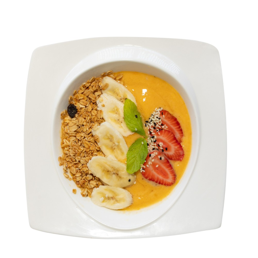 Mango, Guineo, Piña, Fresa, Zumo de Zanahoria, Granola, Leche Vegetal y Pasta de Nueces a Elegir