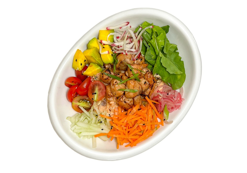 Salmón, Aguacate, Mixto de Lechugas, Remolacha, Pepino, Tomates, Zanahoria, Cebolla Marinada, Salsa de Soya, Salsa de Ají Panca, Salsa de Ostra, Aceite de Ajonjolí y Ajonjolí. Arroz, Quinoa o Fideo a su Elección