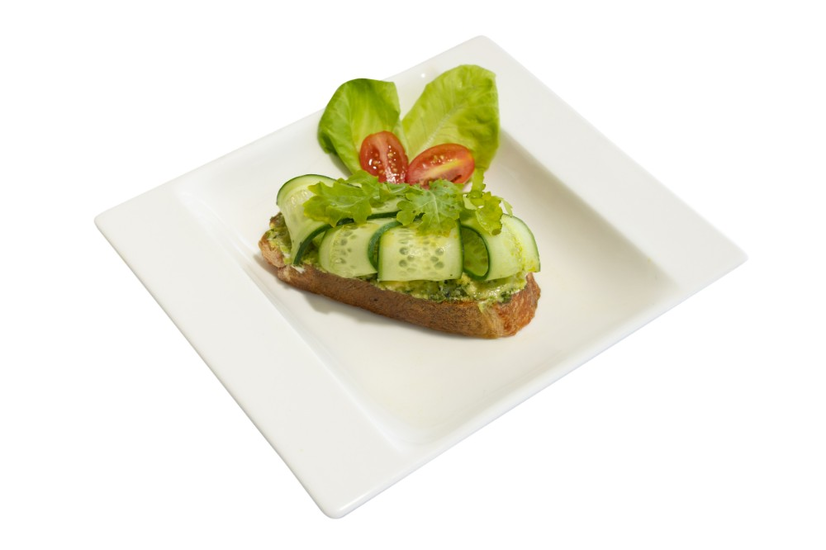 Pan Italiano, Aguacate, Queso Crema, Pesto, Tomates, Pepino, Rúcula, Mixto de Lechuga, Semillas de Sésamo y Aceite Verde
