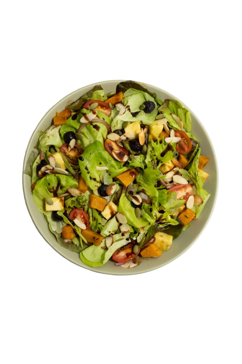 Mixto de Lechuga, Rúcula, Auyama Horneada, Tomate Cherry, Cebolla, Aguacate, Queso Feta, Arándanos, Almendras, Semillas de Calabaza, Vinagreta Balsámica y Crema Balsámica