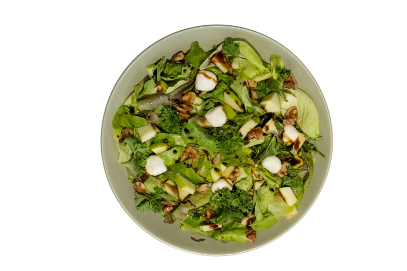 Rúcula, Mixto de Lechuga, Perejil Rizado, Manzana Verde, Cilantro, Jalapeño, Puerro Fino, Nueces, Perlas de Mozzarella, Vinagreta de Manzana y Crema Balsámica