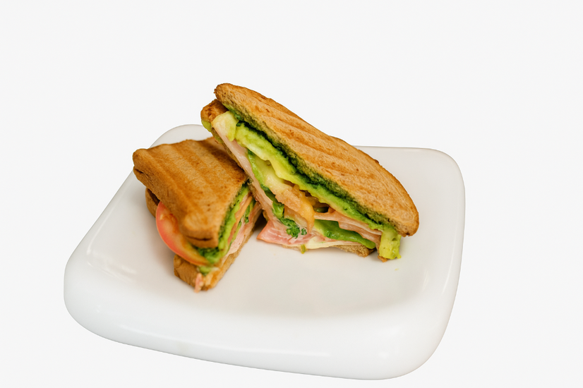Camarones, Pan Tostado, Pesto, Rúcula, Tomate, Aguacate, Cebolla, Mayonesa Sriracha y Ají