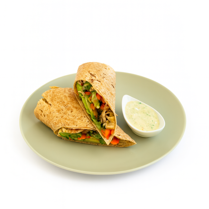 Pollo Flameado, Mixto de Lechugas, Aji, Aguacate, Pepino, Tomate, Zanahoria, Mayonesa Casera y Salsa Soy-Ginger